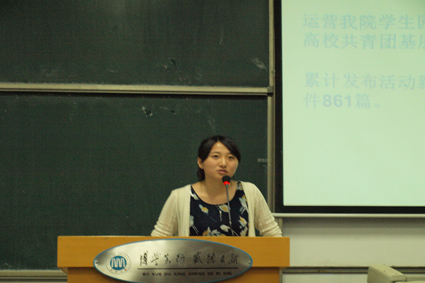 表彰后,团委管胜昔书记进行讲话,她列举了第十二届团委学生会所取得的部分成绩并对大家辛苦工作表示感谢。随后,她对新一届团委学生会的工作提出了三点要求:端正工作态度,注重团结意识、责任意识与集体意识;工作中要保持学习的心态,努力提升自我;工作的同时要树立创新意识。她希望大家能积极、努力展现自我,注重与他人合作以及部门协作。