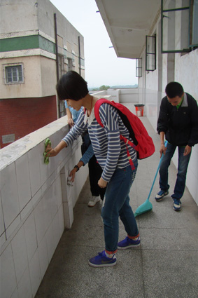 中午我院团员各自携带卫生工具按时到达三教,准备清理三教三到五楼的教室。各组在进行工作分配后,便开始有条不紊地清理教室。大家不怕脏不怕累,扫地、擦桌椅、擦黑板、清理墙上的牛皮癣,认真而仔细地完成自己分到的任务。在活动过程中,男生们承担了提水,倒垃圾等较重的任务,女生们则更多地做擦洗工作,这样的分配使清扫更有效率,也体现了同学们之间的团结协作。