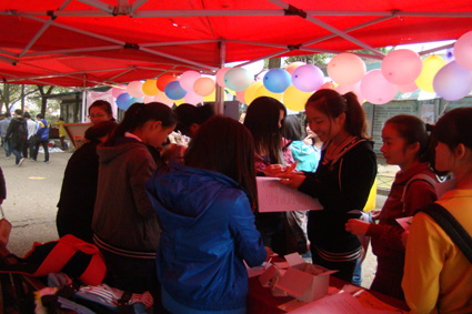 在北苑摆点处,有专业人员为女生免费化妆,此活动吸引了很多爱美女生的参与,她们或是咨询,或是体验,北苑顿时热闹非凡。此外,女生们还可以在卡片上写下自己的姓名和联系方式,参与抽奖活动,奖品有BB霜、面膜等。