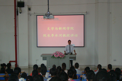 院长季水河教授在典礼上做了激情洋溢的讲话,他首先代表老师向新生表示热烈的欢迎。季水河院长引用各种数据向全院新生介绍了文新院各专业在全校、全省乃至全国的地位,并介绍了我院的精品课程,引导新生树立文新人的骄傲。稍后,季院长还分析了人文科学的就业前景,指出时代发展要求重视人文科学的社会现实。最后,季院长详细讲述了大学生应当怎么做的问题,他谈到,大学生首先要有志向,而后要脚踏实地努力学习,并且要做到行知结合,培养“能说、会写、人际交往”的能力,以适应开放型社会的要求。