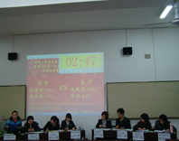 本次比赛是复赛的第二场,辩题为“China should continue the practice of web-sale of train tickets”, 我院陈雅,邹雨柔为一队,分别为正方三四辩,另一队为高点点,沈照宇,为反方一二辩。另外,外语院一队为正方一二辩,反方三四辩是研究生队。选手陈述流利,有风度,使得比赛富有观赏性。