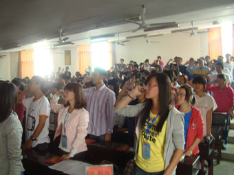 大会在《青年志愿者之歌》的歌声中拉开帷幕。我院第十一届团委学生会主席雷亚男在开场致辞中说到:“作为当代大学生,应该为集体,社会做出一些贡献,让集体,让整个社会变得更加美好。”同时他欢迎大一新生以饱满的热情加入志愿者队伍,并希望他们可以将志愿者精神不断传承下去。紧接着我院团委学生会青支部部长沈照宇向大家介绍了“朝阳红义务支教、爱心血库、爱心护书、寝室绿色行动”四项青年志愿者常规活动,呼吁大家积极参与。主席团成员为朝阳红义务支教辅导员颁发聘书后,上年度优秀志愿者陈乾朗上台发言。最后,大会在我院团委第一副书记田欢的领誓、各位志愿者宣誓下圆满落下帷幕。
