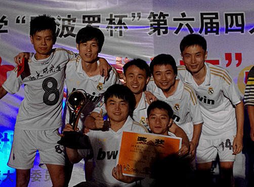 在研究生一队的八名队员中,我院共有四名主力队员,分别是2009级新闻学王轶、2009级传播学赵理、孙成以及2011级传播学丁嘉伟。经过激烈的角逐,最终,研究生一队摘得了四人制足球赛冠军。(文\刘勇 图\刘翔)