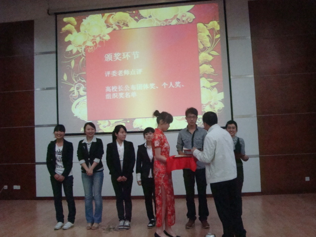 以《Prepare the best and enjoy the most》为主题的英语演讲比赛进行地别具风味、如火如荼。其中,我院09级广告2班的张璐与09级新闻2班的彭姣代表我院与各院选手展开了角逐,凭借流利的口语和从容大方的表现,分别以87.7和87.82的成绩摘得三等奖和二等奖;此外,我院还荣获团体奖三等奖和优秀组织奖。