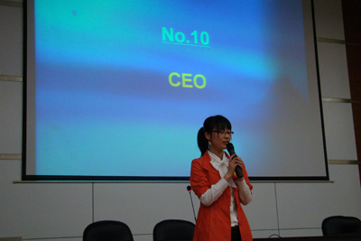 非专业组比赛随后开始,比赛分为现场解说——我是世博解说员、产品推销、竞职演讲三个环节。十二名选手变作世博解说员,配合自己制作的精美的幻灯片,用英语向大家解说世博,展示多个省馆的风采。在竞职演讲环节里,各位选手根据选定的职位,向大家演讲,竞选该职位。