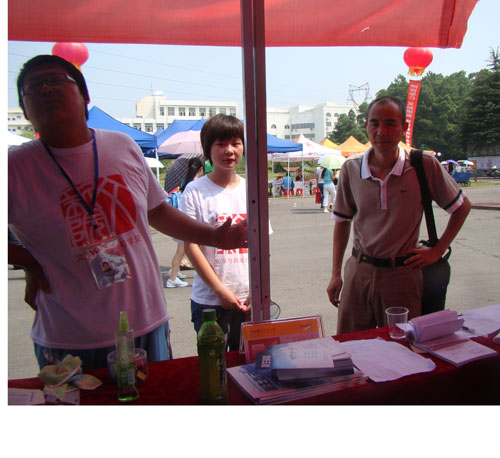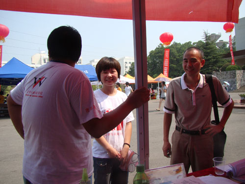唐书记一个人走向我们的接待点,正好在前台询问报到情况的团委学生会主席涛哥和第二团副谢雯姐,及时向唐书记做详细介绍,至此时我院317 名新生仅剩21位尚未来校报名。除此之外,唐书记还问到今年的我文新院的新生手册,并对其中新增的更加详细的内容给与肯定。看到正拿着相机拍照留念的宣传部部长黄胜源,唐书记关切的问到,宣传部门是否持有长期专用的相机。关于接待台一端的商业保险业务办理情况,唐书记也一一问到。