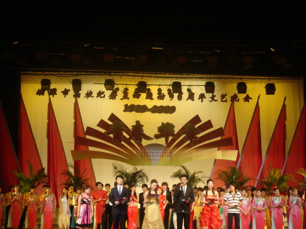 紧接着由三校联合打造的湘潭市高校纪念“五四”运动90周年青春华章文艺晚会倾情上演,节目精彩纷呈,显然各个学校都拿出了本校最优秀的节目,一场视听盛宴,给了在场的观众以美的享受,场下掌声不断,喝彩连连。晚会也在有三校教师联合演唱的《年轻的朋友来相会》和学生代表联合演唱的《二十年后在相会》的歌声中圆满幕。