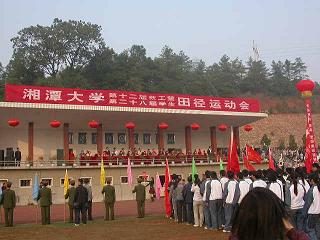 接下来进行的是升旗仪式,庄重的国歌、校歌响罢国旗、校旗交相辉映飘舞在二田上空,红蓝三旗将见证接下来体育健儿们的精彩表现。之后副校长陈小明致开幕词,他首先感谢为此次运动会召开而付出辛勤劳动的教师和学生,他说我校的体育文化一直在蓬勃发展并已成为湘大一道亮丽的风景线。他希望我们的体育健儿以高昂的斗志赛出体育精神,要求裁判员公平公正,倡导把“更高、更强、更快”的奥运精神注入我们的运动会中,并预祝本次运动会顺利进行。接着运动员代表沈承德、裁判员代表蒋琳分别进行宣誓,他们宣誓要以真正的体育道德参加这次运动会,力构一个和谐公正的运动会。