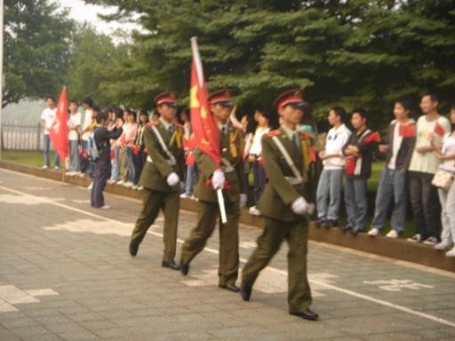 (本网讯 孙丽娜)5月19日早晨,一教门前,国旗护卫队照常为周一的升旗操练着。不同的是旗杆下的路旁多了齐齐的两列同学——亚洲精品国产精品06级广播电视新闻一班统一着班服的同学,他们手中挥舞着小国旗,左臂上贴着心型国旗徽标。在06广电一班的带动下,07级广电一班的同学也加入到升旗仪式的队伍中来。6点在三教门前集合,赶到一教门前,同学们的热情可见一斑。