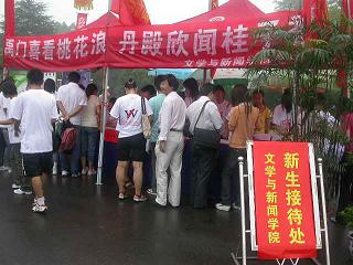 (本网讯)28日,新生报到正式开始了,迎新工作迎来了最紧张的时刻。 早上五点,天还没亮,文新院团委学生会的成员相继来到俱乐部门口,开始了一天紧张的工作。6点不到,天空下起了瓢泼大雨,给迎新工作增加了困难,但学生会赶紧联系了备用伞,以便给来报道的新生和家长用。