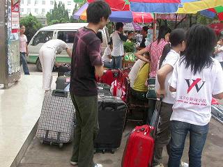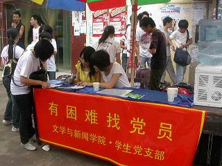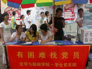 (本网讯)在文新院的迎新工作中,本院学生党员也积极参与其中,为迎新工作贡献自己的力量。 党员义务岗设在北苑男生宿舍门口,大大的红色喷绘“有困难,找党员”六个字特别醒目。党员义务岗的值班人员主要是刚步入大二的各班的党员和部分入党积极分子,他们的工作主要是为新生解答疑惑和接待从南苑行李站运过来的学生行李,并帮忙将其运到学生宿舍。同时,义务岗的成员积极配合迎新总站的工作,机动的插入到人手不够的岗位中,充分体现了我院党员的良好的思想风貌。