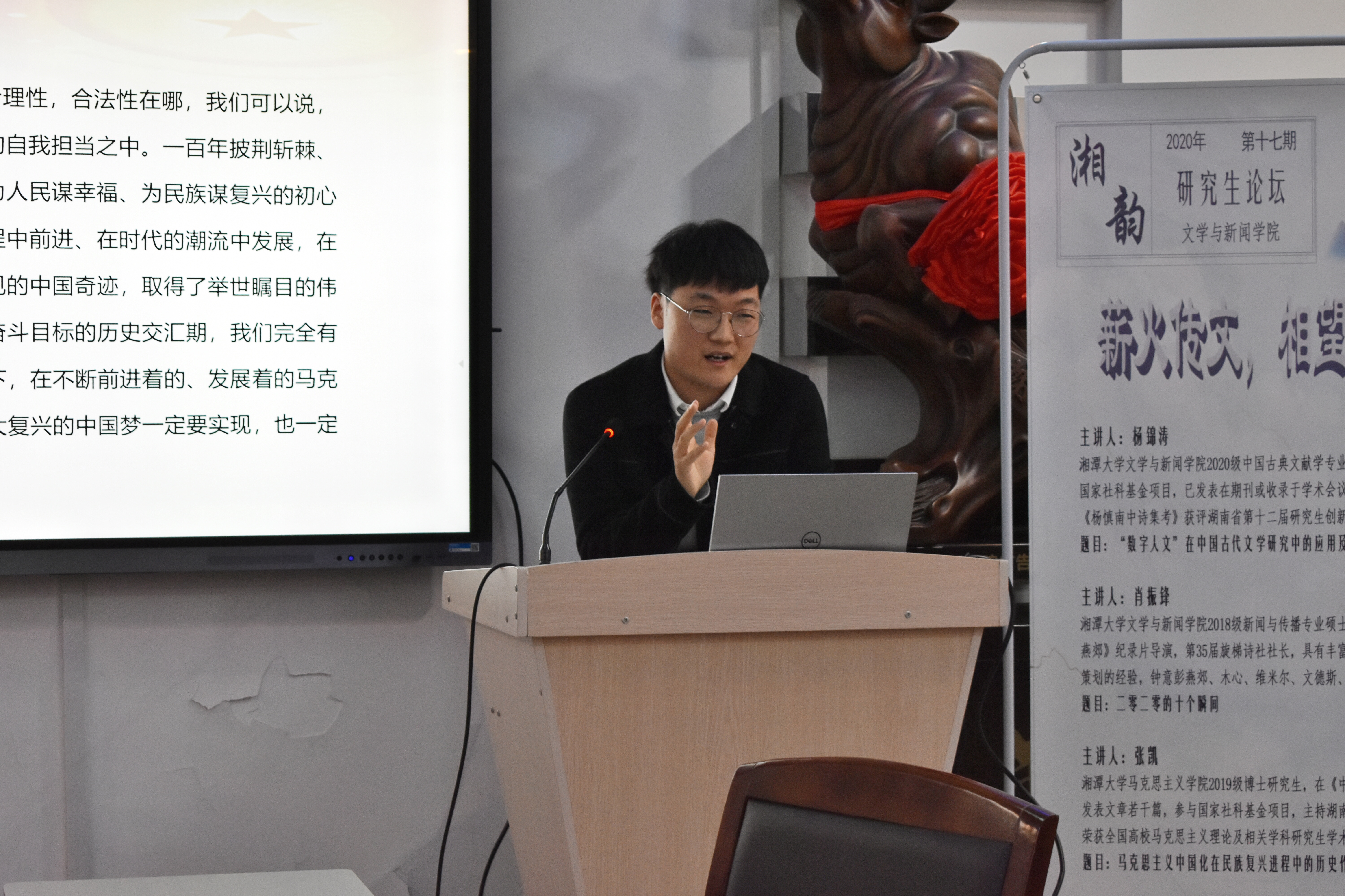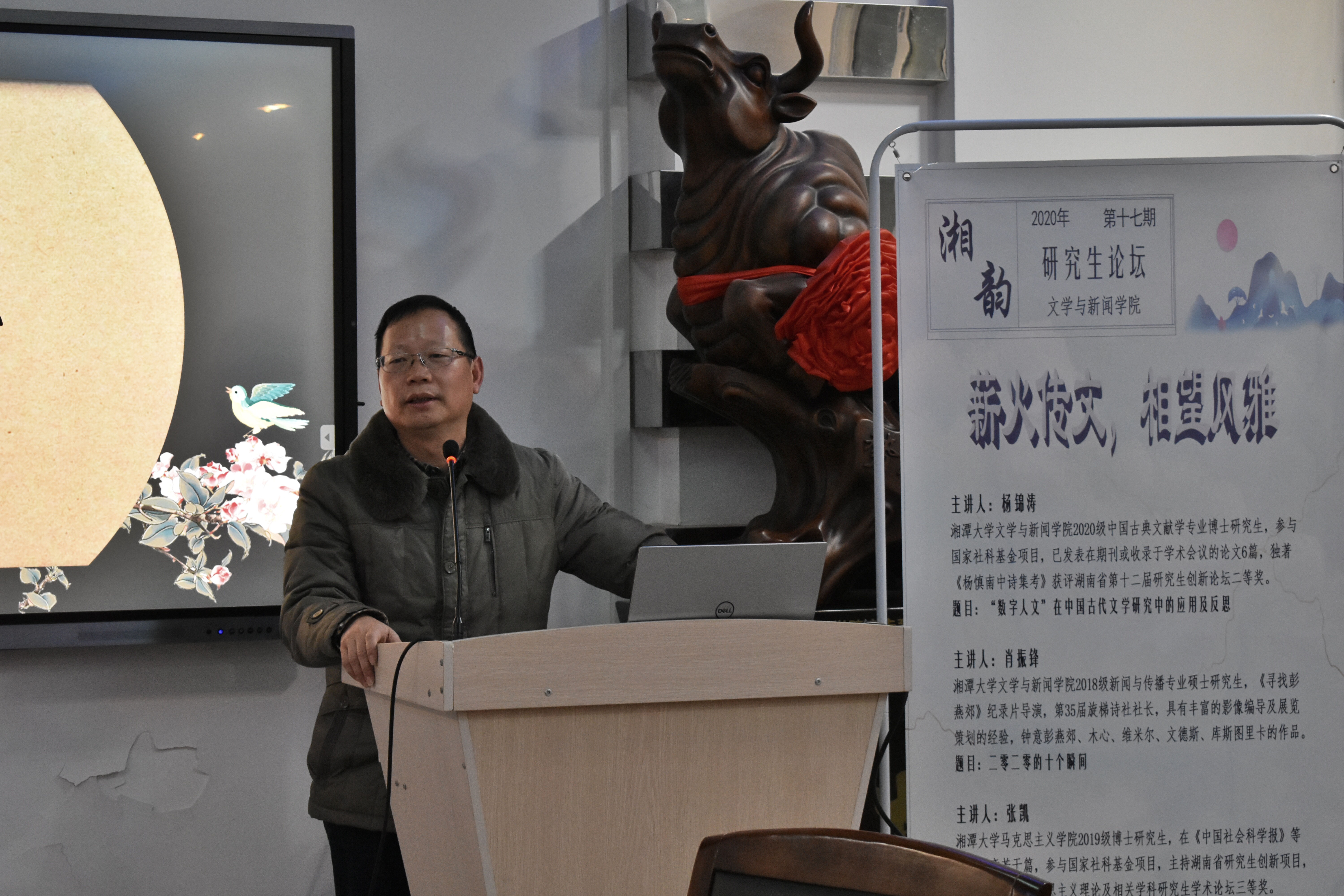 (通讯员 赵湘慧 全艳琳 张文苑 摄影 庞悦)12月11日下午14:00,由湘潭大学研究生会、研究生团委主办,亚洲精品国产精品研究生会、研究生团总支承办的“薪火传文,相望风雅”——第十七期“湘韵”研究生论坛在文科楼318会议室成功举办。