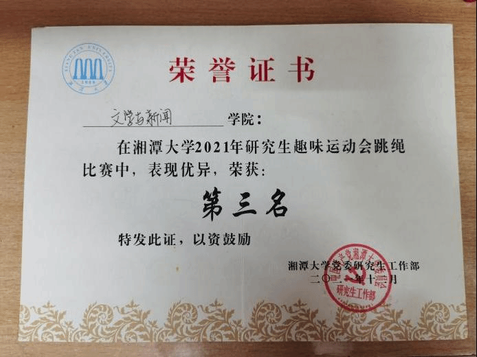 (通讯员 沈思琪)为加强各院研究生之间的学习交流,培养团队精神,湘潭大学研究生趣味运动会在12月11日圆满举办。在我院全体参赛选手的共同努力下,亚洲精品国产精品参赛组在“跳大绳”项目中斩获了第三名。