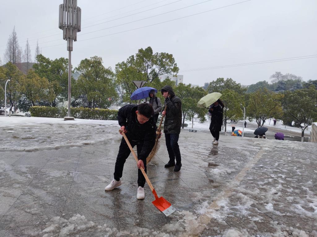 活动发起后,同学们响应迅速。尽管室外温度最低至零下三度,同学们的手和脸都冻得通红,但这丝毫没有影响到大家的热情,手持铁锹、扫帚,铲除积雪,清扫路面,团结协作,干劲十足。经过共同奋战,学校逸夫楼考点大门及台阶的积雪被打扫得干干净净,扫雪任务初步完成。