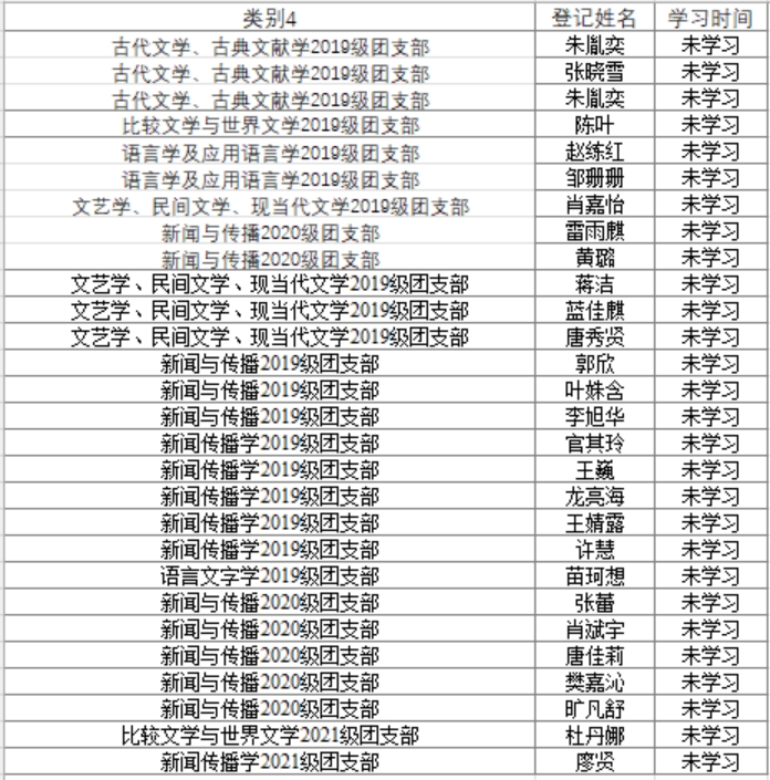 青年大学习第十二季第9期学习已截止,截止时间为12月5日晚七点。现将未学习名单公布如下。请各团支部书记今后务必认真督促团支部成员,落实每周青年大学习的完成。