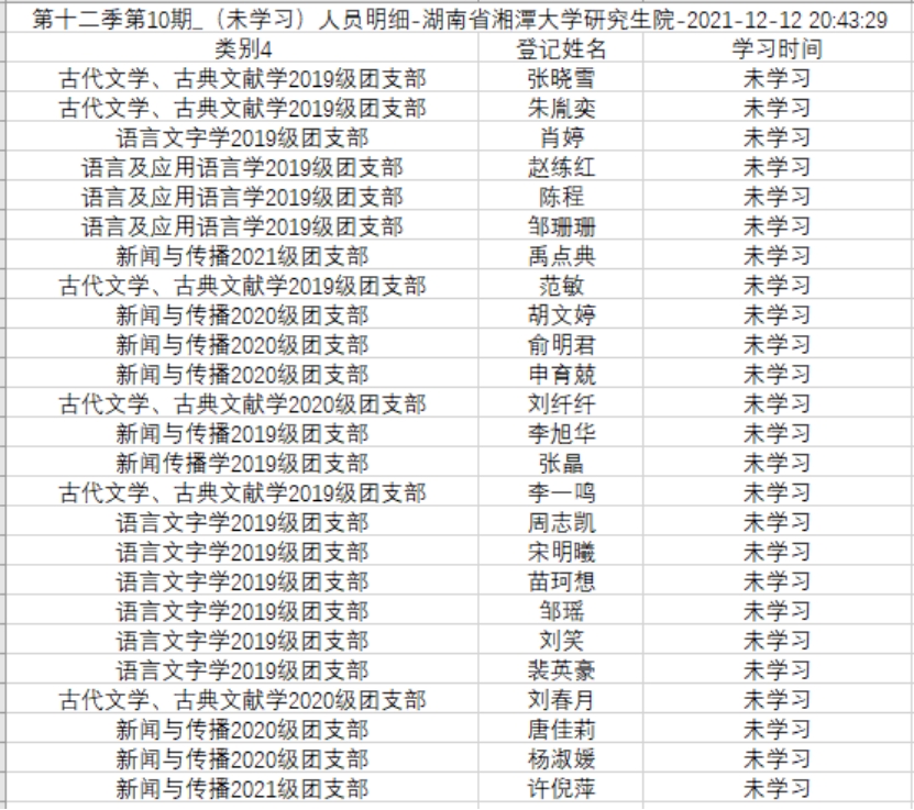 青年大学习第十二季第10期学习已截止,截止时间为12月12日晚七点。现将未学习名单公布如下。请各团支部书记今后务必认真督促团支部成员,落实每周青年大学习的完成。