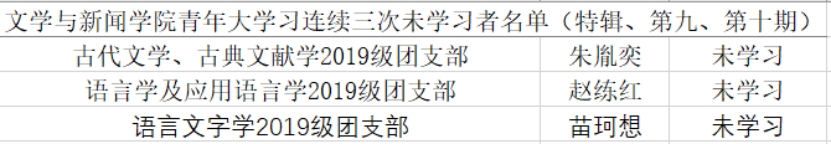 现对学院连续三次(特辑、第九期、第十期)青年大学习未学习同学进行通报批评。连续三次或累计五次未学习,取消本学年五四评优、下一学年优秀研究生干部、三好研究生等评优资格。