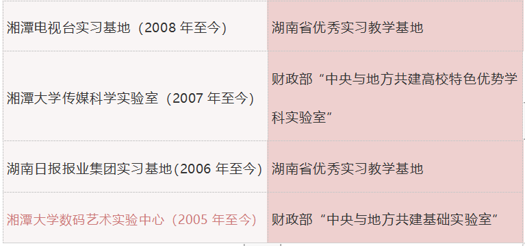 拥有湖南日报、湖南出版投资控股集团、湖南广播电视台、新湘评论、红网、腾讯大湘网、长沙晚报、新华社湖南分社、长沙广播电视集团等15个教学实习基地,其中湖南日报报业集团、湘潭电视台等为湖南省优秀实习教学基地。还有湘潭大学-湘潭广电传媒集团校企合作人才培养基地为省级示范基地;湖南日报报业集团为省级研究生培养创新基地;湖南日报报业集团、湘潭广电传媒集团为省“为改革攻坚献策”对口服务联系点。