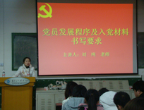 首先,刘纯老师从党员发展程序、入党材料书写要求两方面给大家教授了《入党程序》,并指出党员发展程序包括确定入党积极分子、对入党积极分子的培养教育、发展对象的教育、预备党员的接收以及预备党员的管理、教育、考察和转正五部分,使同学们大致掌握了入党的相关事宜。而后,刘老师向同学们介绍了入党申请书、入党自传材料以及思想汇报的写法、要求和格式,让同学们进一步了解了入党材料的书写要求。课堂最后,她勉励同学们要牢记党员的义务和责任,严格要求自己,争取早日入党。