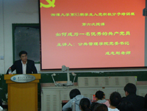 第六次授课则由公共管理学院党委书记成志刚教授担任主讲,他就如何成为一名优秀的中国共产党员的问题,从正确认识共产党员的责任、加强党性修养、充分发挥党员的先锋模范作用三方面提出建议。