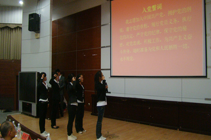 随后,我院12级5名新生党员登台,刘校长与唐书记为其佩戴党徽,他们面对党旗庄严宣誓,“我志愿加入中国共产党,拥护党的纲领,遵守党的章程···”清脆而有力的誓词弥漫在每一个人的心中。