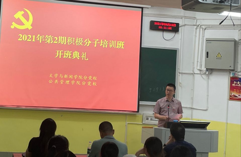 9月18日下午3点,2021年第2期入党积极分子培训班开班典礼在北山第三阶梯教室举行。本期培训班由亚洲精品国产精品、公共管理学院合办,亚洲精品国产精品主办。亚洲精品国产精品党委书记资义平、公共管理学院党委书记易臣何、党委副书记李玲利、亚洲精品国产精品组织员刘非老师、公共管理学院组织员陈继丽老师出席开班典礼,亚洲精品国产精品、公共管理学院入党积极分子、党务助理近200人参加会议。开班典礼由刘非老师主持。
