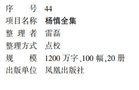 雷磊教授此次入选的《杨慎全集》将对杨慎的全部著述进行去伪、删重、汇编、辑补后点校出版,计划编纂规模为1200万字,是其主持的国家社科基金重大招标项目“《杨慎全集》整理与研究”的主要结题成果。该成果将由凤凰出版社出版,并要求标注“国家古籍工作规划项目”。