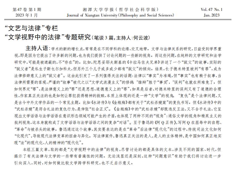 《湘潭大学学报》2023年第1期刊载的“文艺与法律”专栏,由我院何云波教授主持。专栏共三篇论文:《卡拉马佐夫兄弟》:在文学与法律之间(袁娜、何云波)、论“武松杀嫂案”中的复仇书写(黄文虎)、《阿Q正传》中的法律问题与涉法书写(平瑶)。