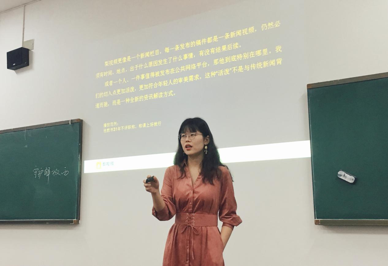 梁瑞玉老师毕业于湖南师范大学新闻与传播学院,在大三时就已成为梨视频的拍客,并在实践中逐渐掌握了拍视频的技巧。此次梁老师围绕着四个部分将她的干货分享给同学们,分别是“对梨视频稿件的分类”、“梨视频稿件的要素及特点”、“稿件质量:什么样的内容自带流量”、“拍摄中的常见问题”。