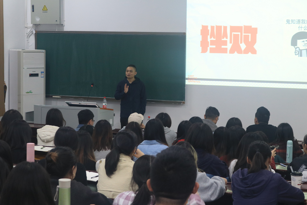 讲座伊始,唐琰用幽默的开场回顾了自己在湘大广告系的求学经历,其对专业学习的认真和用心深深感染着在场的同学们。谈起实习经历,唐琰用“挫折”二字形容,同时告诫同学们,要正视挫折,坚持下去,就会迎来光明。