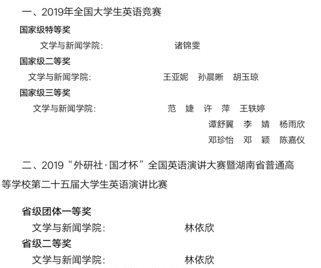 近日从学校有关部门获悉,我院在2019年全国大学生英语竞赛、第十一届全国大学生广告艺术大赛、2019“外研社·国才杯”全国英语演讲大赛、第四届湖南省大学生写作大赛等国家级、省级学科竞赛再创佳绩。共有62名学生、10多名指导老师获得表彰奖励。