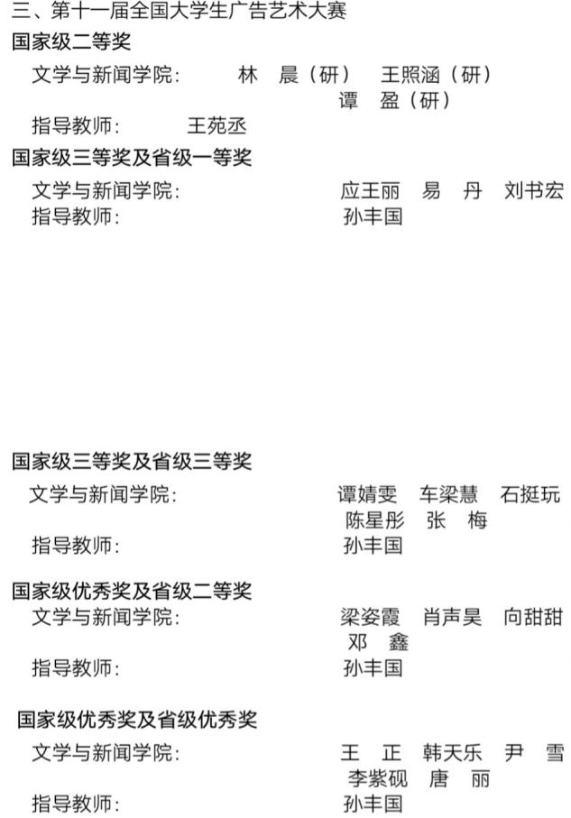 在第十一届全国大学生广告艺术大赛中我院获奖人数达40人,我院一向非常重视、认真组织、学生参赛热情高,专业能力过硬。研究生林晨、王照涵、谭盈在本次大赛中获国家级二等奖;应王丽、易丹、刘书宏获国家级三等奖及省级一等奖;谭婧雯、车梁慧等五人获国家级三等奖及省级三等奖;梁姿霞、肖声昊等四人获国家级优秀奖及省级二等奖;王正、韩天乐等五人获国家级优秀奖及省级优秀奖;习绫卿获省级一等奖;刘小琦、林晨等十一人获省级二等奖;沈子杰、陈柏霖等九人获省级三等奖。学生取得优异的成绩不是偶然的,除了自身坚持不懈的努力,离不开背后默默付出的指导老师。王苑丞老师与孙丰国老师在这次大赛中指导学生,为学生提供了很多的帮助。