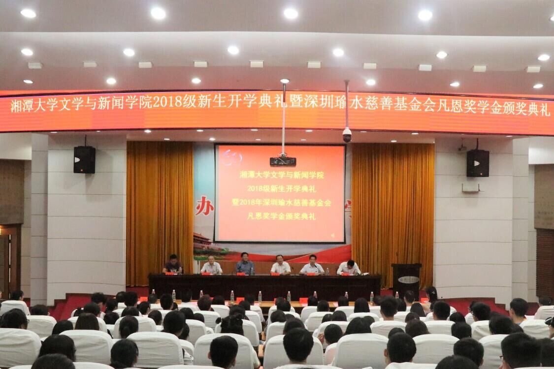 9月1日上午,我院2018级新生开学典礼暨深圳瑜水慈善基金会凡恩奖学金颁奖典礼在逸夫楼报告厅举行。副校长刘建平,我院77级院友、湘潭大学深圳校友会资深顾问、深圳听涛诗社社长、深圳市瑜水慈善基金会名誉理事长高源,深圳市瑜水慈善基金会项目总监彭彪,凡恩集团王康杏,教务处副处长宋德发,以及学院领导班子成员李剑波、赵猛、季多武、周鹏飞、田华、刘晓丽和各系主任、2018级新生班级班主任、学工办老师,与394名2018级本科生和硕士、博士研究生共同参加了开学典礼和颁奖仪式。开学典礼由院党委书记赵猛主持。