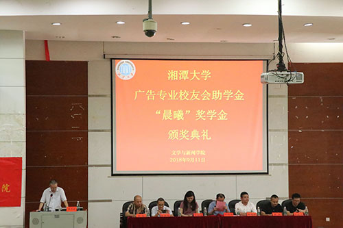 9月11日下午,湘潭大学广告专业校友会助学金、“晨曦”奖学金颁奖典礼于逸夫楼第二报告厅举行。副校长刘建平、广告专业校友易建国、杨乐、阳曦曦、傅硕慧、罗丹,兴湘学院党委副书记樊军,院领导李剑波、赵猛、季多武,周鹏飞、田华、刘晓丽、学工办以及广告系全体师生参加。整个活动由院长李剑波教授主持。