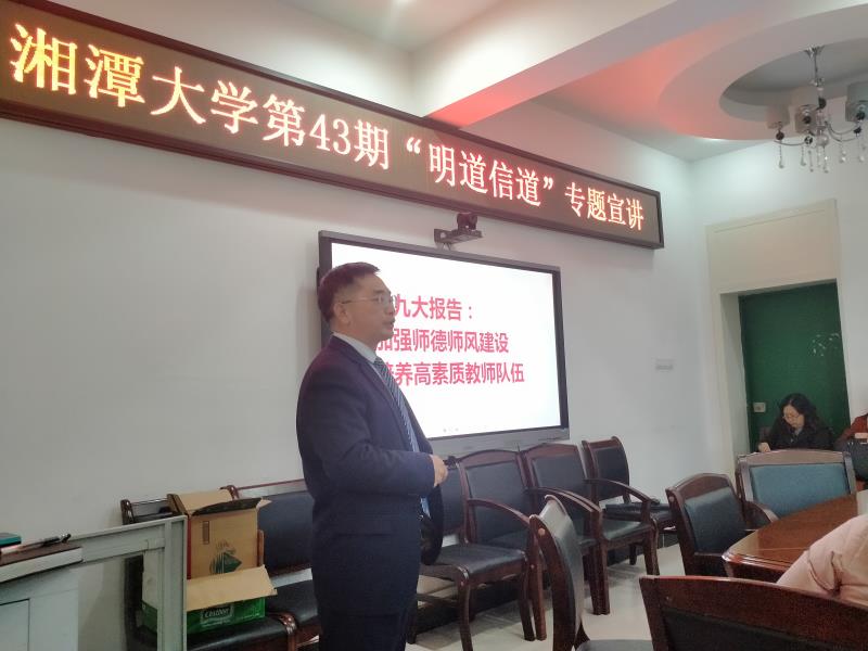 11月24日,湘潭大学第43期“明道信道”专题讲座在亚洲精品国产精品开讲,党委教师工作部部长、教师教学发展中心主任刘稳丰应邀为该院全体教师作“师德师风建设应该常抓不懈”的专题讲座。亚洲精品国产精品党委书记赵猛主持,全院教职工参加。