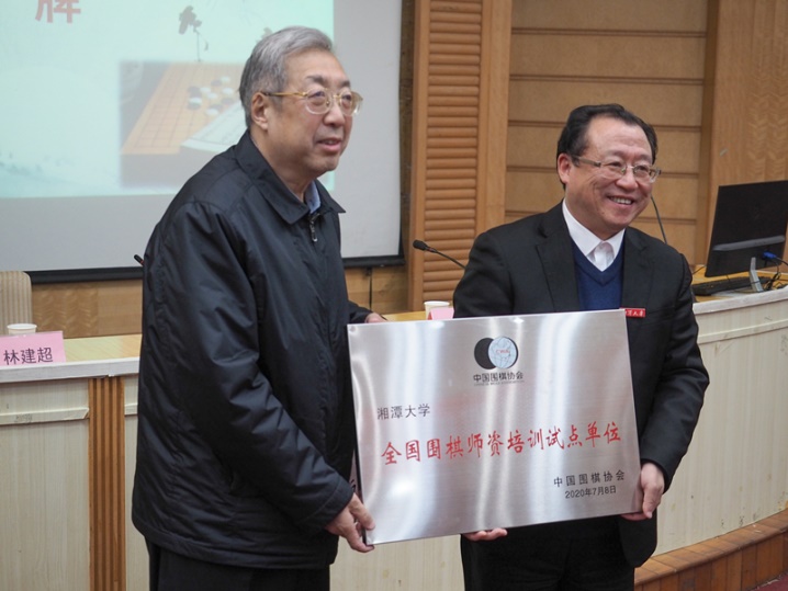 之后,刘建平副校长向林建超主席授予“湘潭大学客座教授证书”。中国围棋协会林建超曾任总参谋部办公厅主任,是党的十七大代表,国防大学特聘教授,曾参加边境自卫还击作战并立战功,长期参与战略筹划与指导。同时,也是中国围棋事业特别是围棋文化研究领军人物,发表重要围棋文论50余篇,其中代表作入选全国高考语文试卷,获中国围棋文化年度大奖。所著《围棋与国家》系列丛书,为首个围棋题材的国家出版基金项目,共10部360万字,为当代中国围棋文化理论的奠基之作。