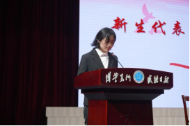2021级本科生代表朱铭铱从修德、苦读和进取三个角度谈到吾辈学子应当时刻扶稳道德标杆,培养高尚德行;以读书为本,秉持初心立身立学;不甘平庸,积极进取,在学习专业知识的同时,积极参与课余活动,积累社会经验。作为文新学子,自当博学慎思、明辨笃行,以期一流学术,高尚德行和光明未来。