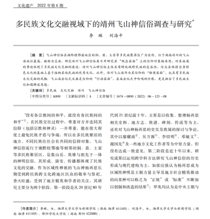我院民间文学方向专业教师李琳教授和其博士刘海平合作完成的论文《多民族文化交融视域下的靖州飞山神信俗调查与研究》刊发CSSCI期刊《文化遗产》2022年第6期。