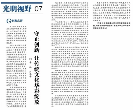 我院李琳教授与博士刘海平合作文章《守正创新 让传统文化华彩绽放》在2023年6月26日《光明日报》理论版刊载。