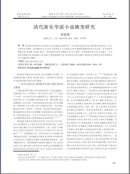 我院古代文学专业教师雷斌慧副教授的论文《清代浙东学派小说嬗变研究》刊发CSSCI期刊《湘潭大学学报》2021年第6期。
