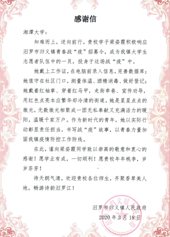 (记者程心愉)青春“她力量”,抗疫显担当。近日,一份来自湖南省汨罗市归义镇的《感谢信》在我院传阅。来信对我院2017级广告系学生梁姿霞积极参与疫情防控工作的事迹表示了敬意与感谢。